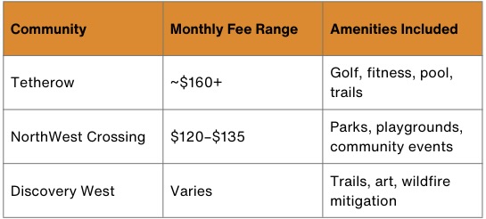 HOA fees generally cover landscaping, snow removal, maintenance of parks and trails, and sometimes extras like security or event programming. Always ask for a detailed breakdown, every HOA is unique.